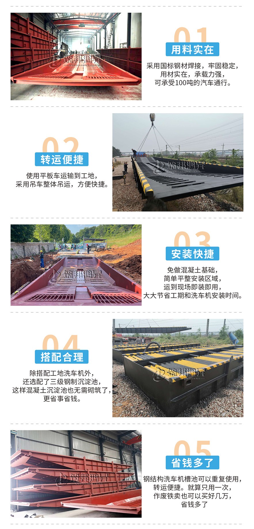 筑邦鴻昇研發(fā)的鋼結(jié)構(gòu)移動(dòng)洗車槽池由鋼結(jié)構(gòu)洗車槽池、工地洗車機(jī)、鋼制沉淀池組成。采用整體設(shè)計(jì),整體吊運(yùn),用料厚實(shí)。替代了之前的工地洗車機(jī)下面的水泥基礎(chǔ),更加牢固方便,節(jié)省了大量的基礎(chǔ)砌筑人工和材料,還可以重復(fù)使用。如果不需要重復(fù)使用;十幾噸重的洗車槽做廢鐵賣,也能賣好幾萬,大大節(jié)省了施工時(shí)間和成本。鋼結(jié)構(gòu)洗車槽池常規(guī)款式有16.6米長和13米長,尺寸可以定制。
