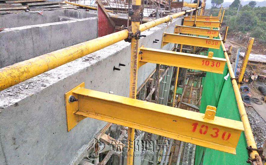 【筑邦鴻昇】新型拉桿式工字鋼懸挑架,通過高強螺栓與結構框架梁錨固,并在前端設置可調拉桿與上一層建筑結構連結,形成可承擔荷載的一次超靜定結構體系。